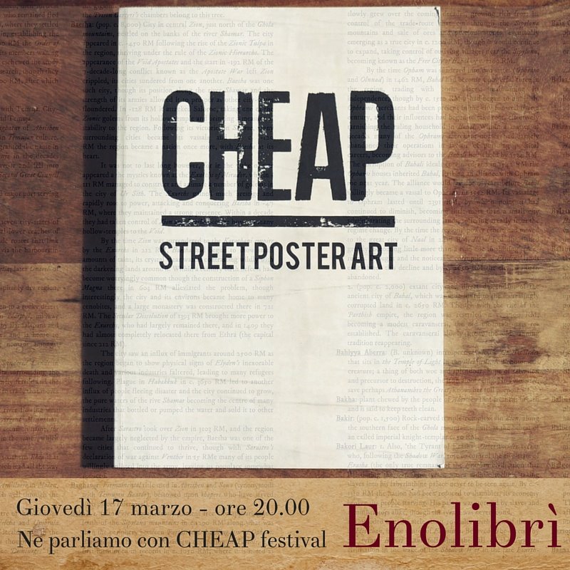 CHEAP vi aspetta il 17 marzo alle 20 ospite di Enolibrì al TPO di Bologna: parleremo di street poster art e del libro che documenta i nostri primi 3 anni di lavoro, l’autoproduzione uscita a fine gennaio 2016 che potrete vedere e acquistare ad un prezzo ridotto durante la serata – vi aspettiamo.