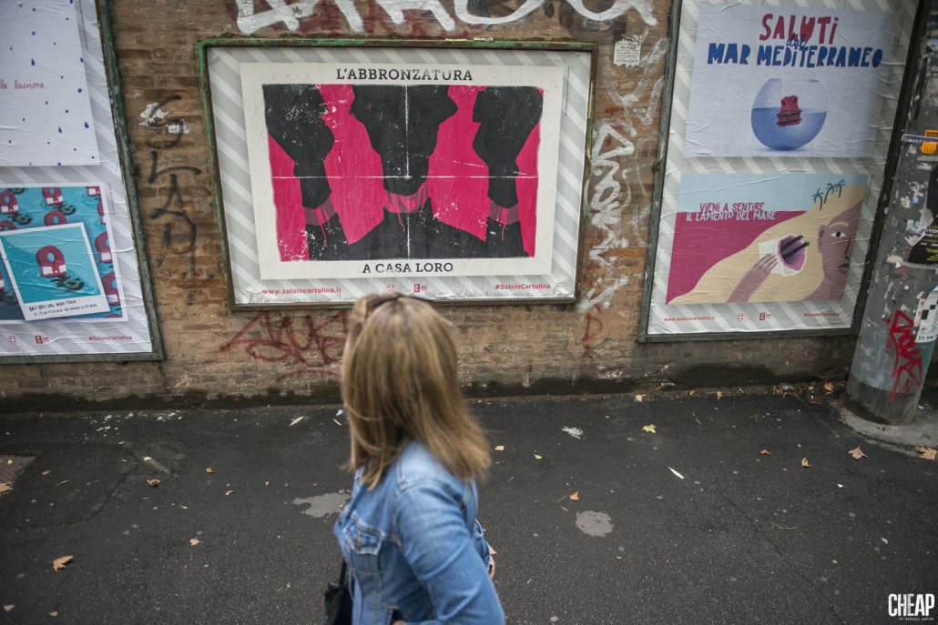 Questa è solo una delle immagini protagoniste dei poster affissi sulle bacheche di CHEAP in via Irnerio a Bologna: tutti i manifesti fanno parte del progetto Solo in cartolina, la campagna di denuncia contro le morti in mare lanciata da un gruppo di giovani creativi italiani per raccontare ciò che succede al largo delle nostre coste e sostenere chi ogni giorno salva le vite dei migranti.