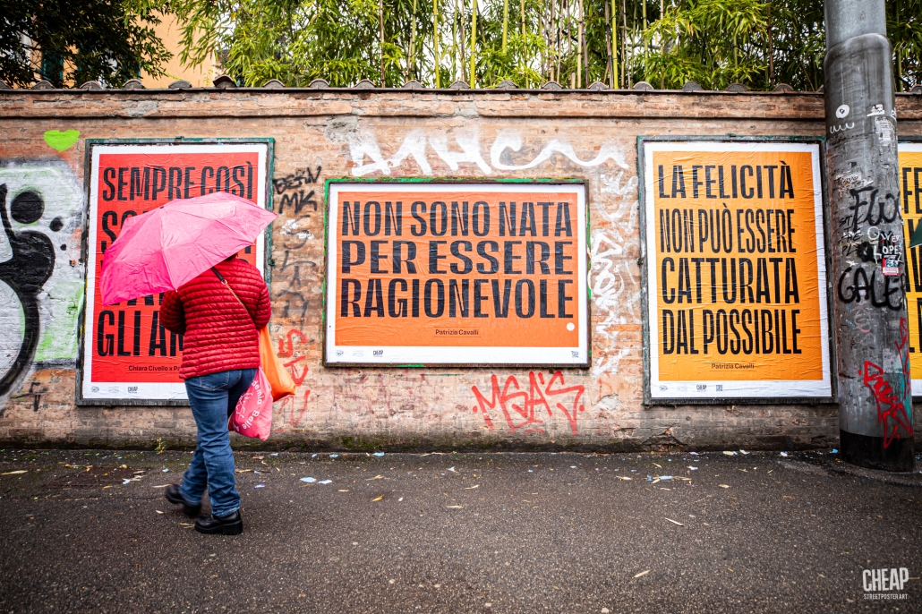 CHEAP torna in strada a Bologna con una nuova affissione di poster dedicati alla parola poetica contemporanea: le parole di Patrizia Cavalli riecheggiano sui manifesti in giro per la città, una collaborazione con Einaudi e l’artista Chiara Civello per il “Sempre Così Tour”, il suo nuovo ciclo di date nato dall’omonimo brano scritto e composto con la poeta – che tocca Bologna il prossimo 8 aprile al Cinema Europa.