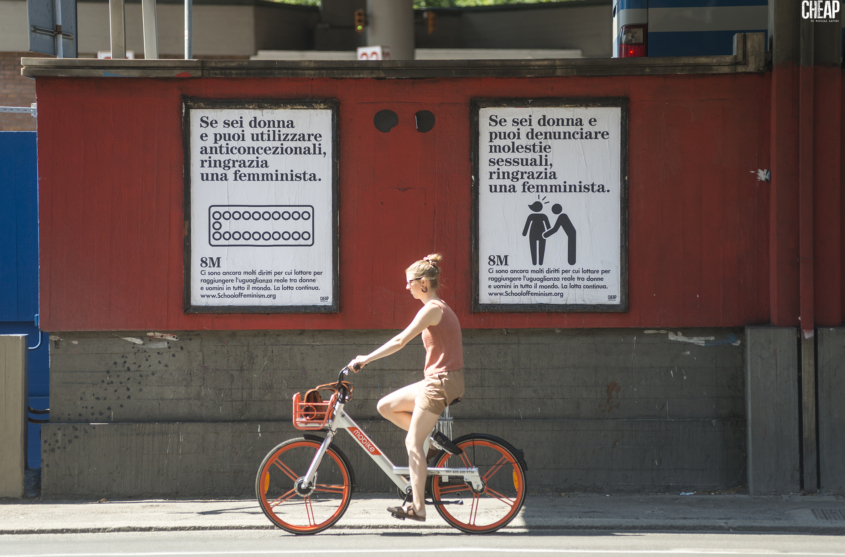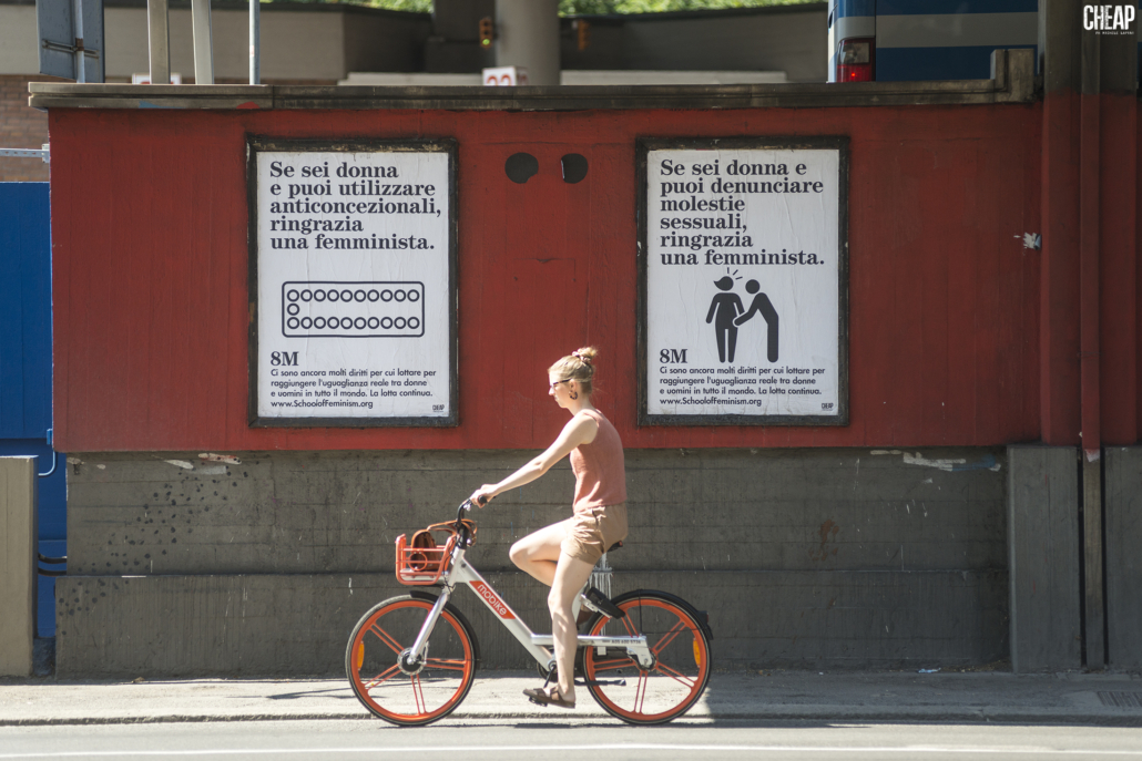 Si tratta dell’ultima affissione di CHEAP, il progetto di street poster art attivo a Bologna dal 2013 e fondato interamente da donne. Da sempre, le energie femministe attraversano gli interventi in strada: a ottobre dell’anno scorso, lo stesso muro di Viale Masini aveva ospitato l’intervento dell’artista canadese Miss Me, sul tema della lotta alla violenza di genere. Oggi la campagna affissa arriva da School of Feminism, una piattaforma internazionale che promuove il femminismo nella società attraverso l’istruzione e la comunicazione. La campagna, resa disponibile online in diverse lingue, è stata tradotta anche in italiano ed è visibile sulle bacheche di CHEAP.