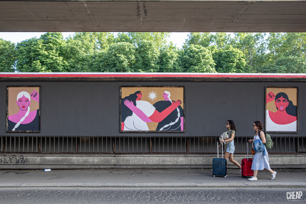Sui 250 metri quadrati e sulle 50 bacheche del muro dell’autostazione di Viale Masini, uno dei segmenti più trafficati e percorsi della città, si fanno spazio i poster e i paste up inediti di un selezionato numero di artistə visivə, con biografie e percorsi disparati ma ricomposti all’interno di un discorso pubblico che propone il femminismo come soluzione. A partire dalla direzione artistica di CHEAP, i poster sono stati realizzati da Bruna Alcantara, Camila Rosa, Cartel de Caracas, Coco Guzmán, Diana Ejaita, Giulia Mazza, Mafreshou, Marta Iorio, Muna Mussie e Yele.